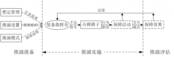 推演模式流程规则包含在系统设计文书中,推演模式的选择需要系统开发的支撑,如推演模式可以规定为在线式推演或离线式推演,推演流程可以采用实时制、回合制或实时制与回合制相结合的方式,但选择的前提是系统具备这些功能。此外还规定了推演的次序和推演阶段设置等,如回合制模式下推演的先手方为哪一方;通常推演划分为作战准备阶段、实施阶段、总结评估阶段,另外还可以根据推演内容的特殊性,在实施阶段进行阶段再次划分,推演特定的训练科目。